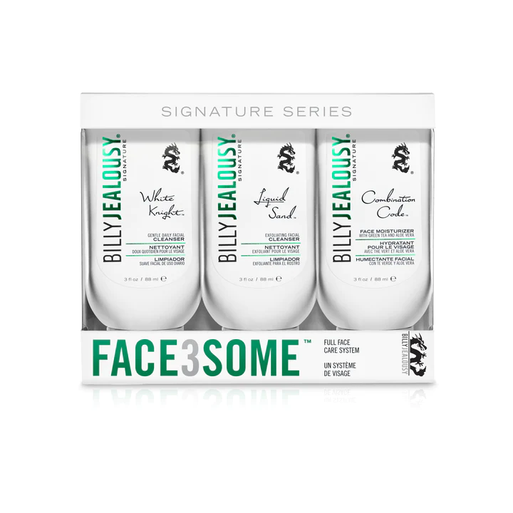 Face3Some features our unique, 3-step skin care system in airline-approved 3oz bottles. Give your skin the attention it needs with this easy to use, 3 step kit designed to unclog pores, refine skin texture, and prevent signs of aging, even for sensitive skin. The kit includes White Knight daily facial cleanser, LiquidSand exfoliator, and Combination Code moisturizer. Together, this trio leaves your skin feeling clean (never tight!), balanced, and deeply nourished.